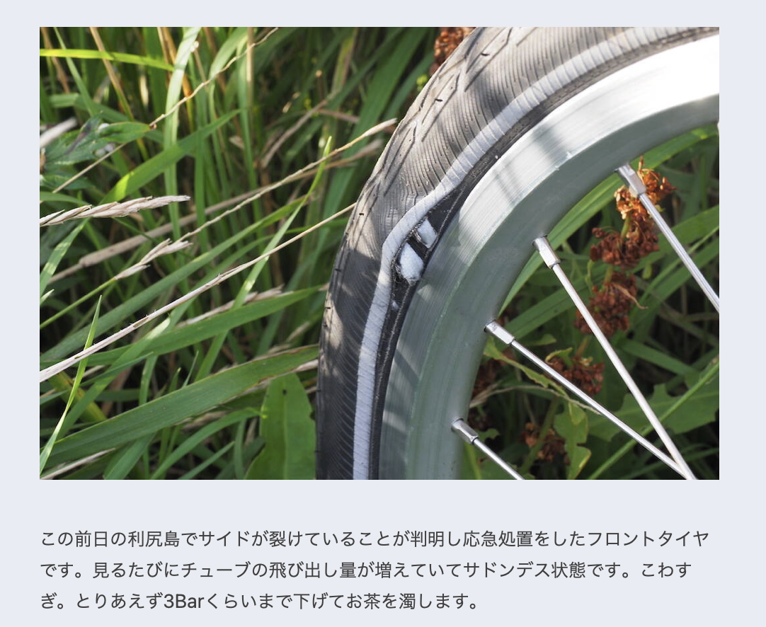 補修翌日は天候の関係で走行距離0だったので、丸一日3.0barで保管したのち最終日のライドを迎えました。この応急処置で予定していた100km超のルートを走れるかどうか、これが今旅最大の検討事項でした。